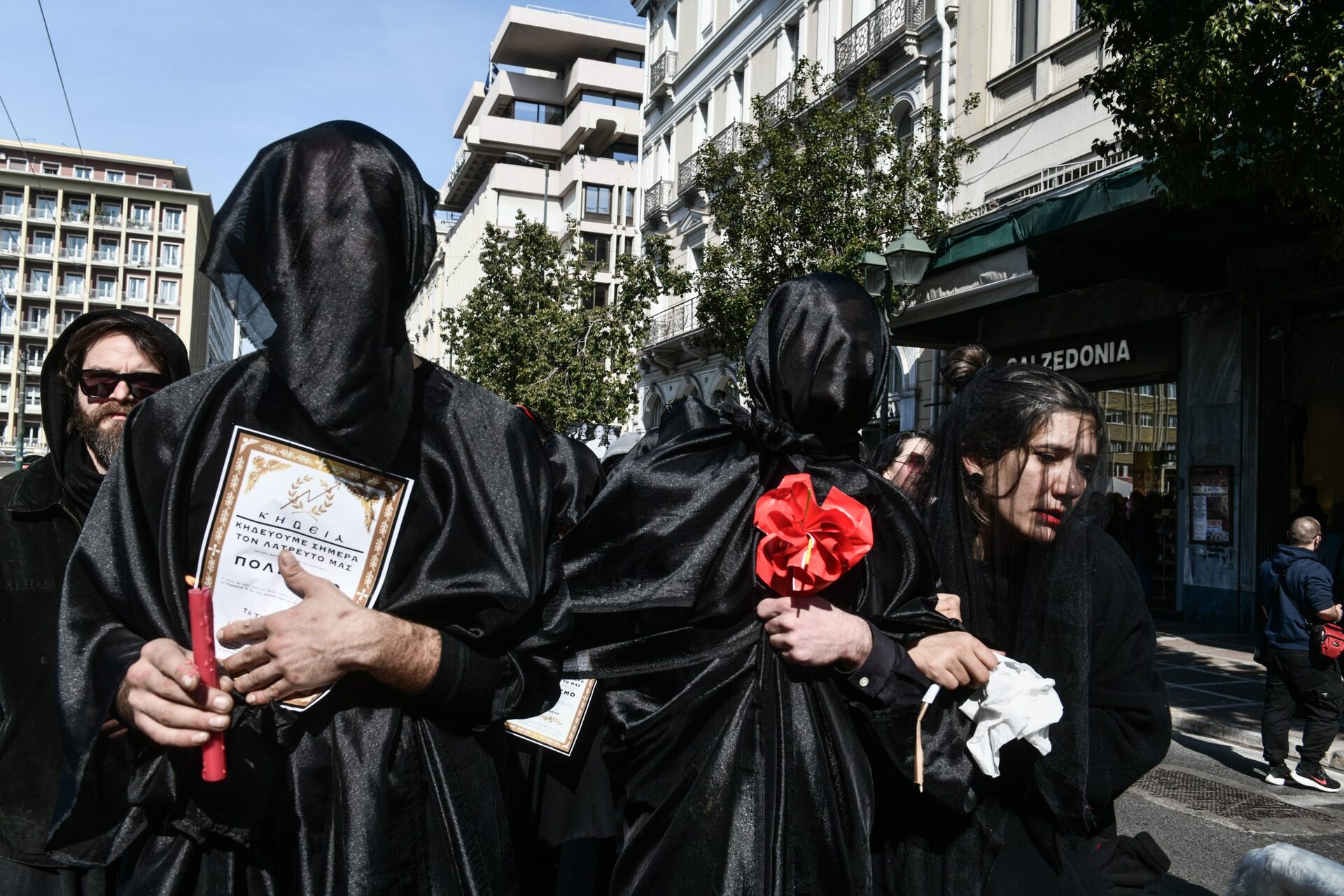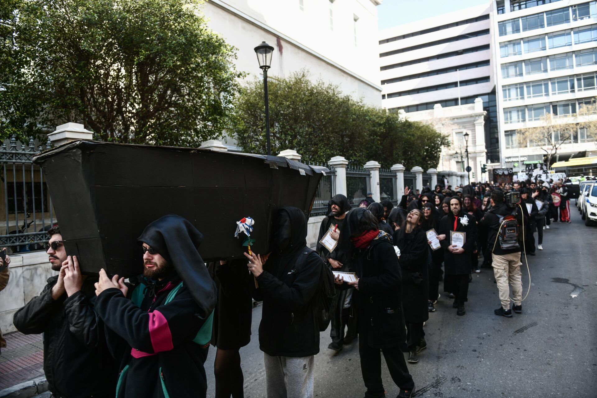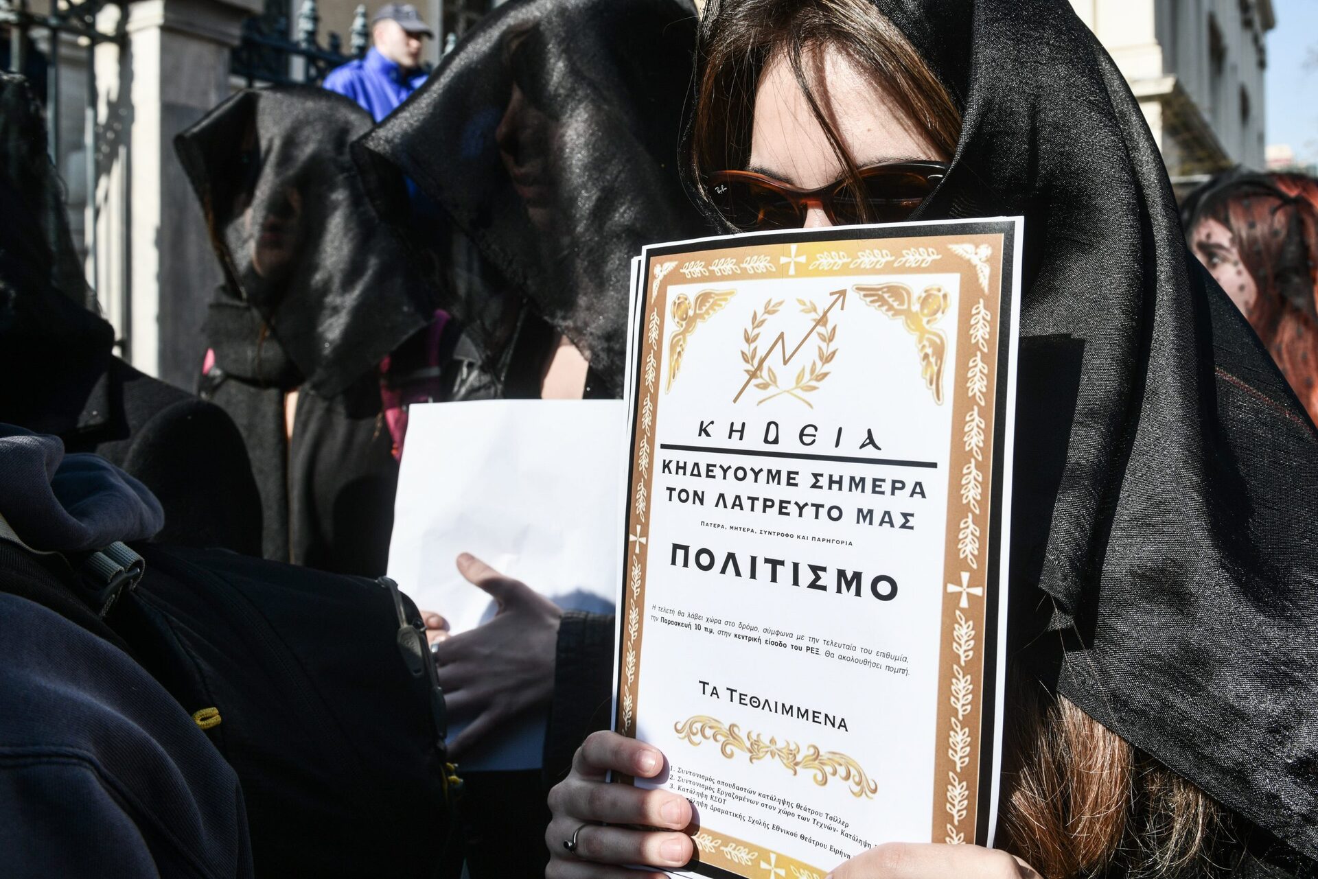 Σε ένδειξη συμβολισμού, μάλιστα, οι διαμαρτυρόμενοι καλλιτέχνες πραγματοποιήσαν την «κηδεία» του πολιτισμού με αρκετούς να φορούν μαύρα ρούχα, κάποιους να κρατάνε κηδειόχαρτα και άλλους να κουβαλάνε μέχρι και «φέρετρο».