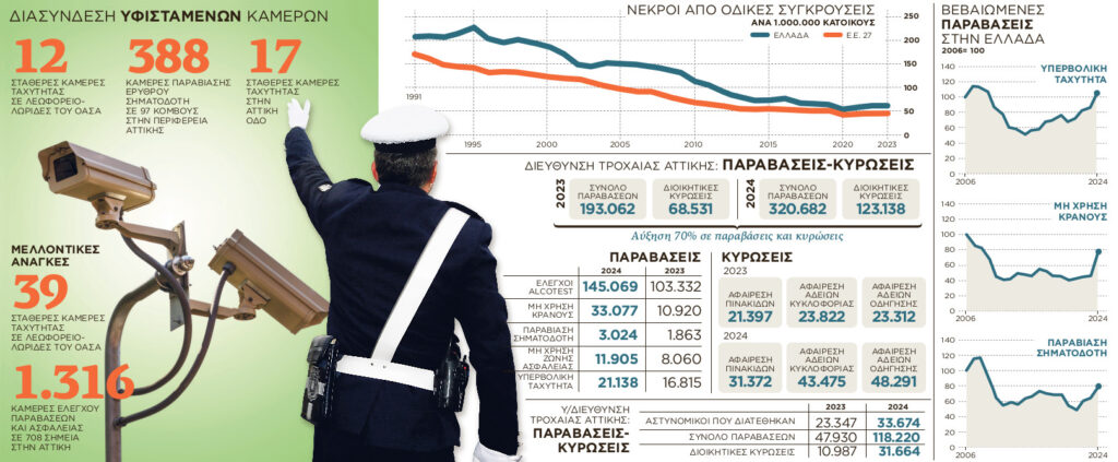 Το νέο σύστημα καταγραφής παραβάσεων έρχεται την ώρα που στην Αττική σημειώνεται πρωτοφανής αύξηση σε παραβάσεις και διοικητικές κυρώσεις που αγγίζει το 70% (443.820). Οι 145.069 αφορούσαν οδήγηση υπό την επήρεια αλκοόλ, 33.077 μη χρήση κράνους, 21.138 υπερβολική ταχύτητα, 11.905 μη χρήση ζώνης ασφαλείας και 3.024 παραβίαση ερυθρού σηματοδότη. Μόνο στον αστικό ιστό της Αθήνας οι αστυνομικοί της Υποδιεύθυνσης Τροχαίας έχουν βεβαιώσει, το 2024, 118.22 παραβάσεις και 31.664 διοικητικές κυρώσεις, με την αύξηση να φτάνει το 150%.