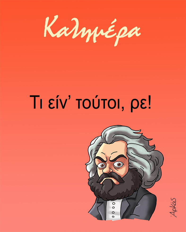 Ο Αρκάς ζωγράφισε τον Καρλ Μαρξ να κοιτάζει με απορία και να αναρωτιέται «τι ειν’ τούτοι, ρε!», σχολιάζοντας με αυτόν τον τρόπο τις εξελίξεις στον ΣΥΡΙΖΑ, ο οποίος αυτοπροσδιορίζεται ως ένα κόμμα της Αριστεράς.