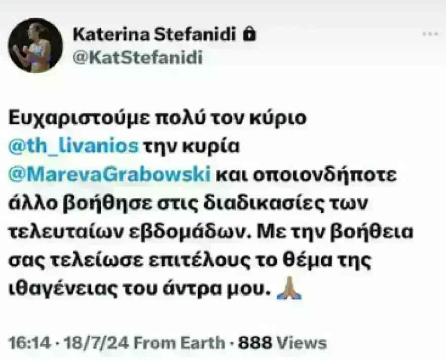 Η Ελληνίδα πρωταθλήτρια και Ολυμπιονίκης ευχαρίστησε τόσο τον υπουργό Εσωτερικών, Θοδωρή Λιβάνιο όσο και την Μαρέβα Γκραμπόφσκι αφού βοήθησαν στο να πάρει ιθαγένεια ο σύζυγος και προπονητής της, Μιτς Κρίερ.