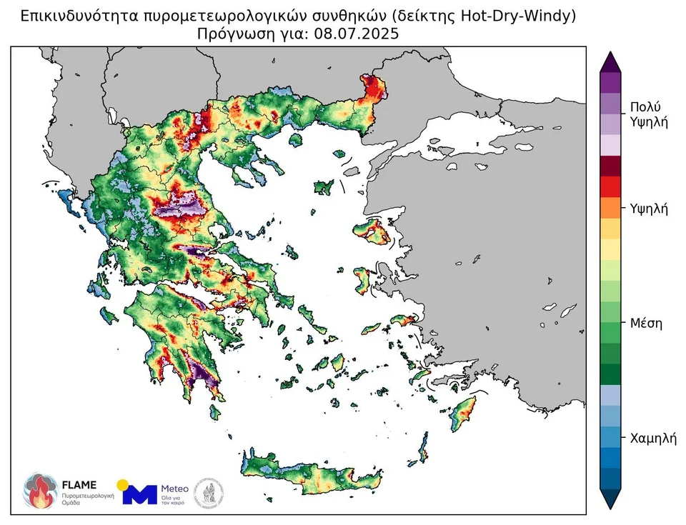 Την Τετάρτη η σημαντική ενίσχυση των βορειοδυτικών/δυτικών ανέμων αναμένεται να οδηγήσει σε ακραίο πυρομετεωρολογικό κίνδυνο σε μεγάλο τμήμα της ηπειρωτικής χώρας και το Ιόνιο, ενώ την Πέμπτη 10 Ιουλίου η ενίσχυση των βόρειων ανέμων πάνω από το Αιγαίο και την ανατολική ηπειρωτική χώρα θα οδηγήσει σε κατά τόπους επικράτηση καιρού τύπου Hot–Dry–Windy.
