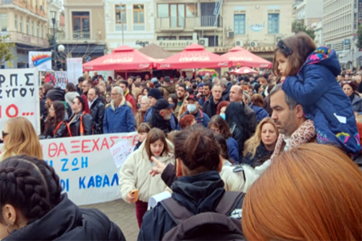 Σύμφωνα με το kavalapost.gr, με την πλειοψηφία τους είναι μαθητές, φοιτητές και νέοι άνθρωποι, αλλά και οικογένειες, ενώ σύσσωμος και ο Κλήρος βρίσκεται στην κεντρική πλατεία, μετά το τρισάγιο που τελέστηκε για τους 57 νεκρούς.