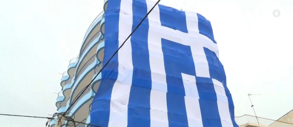 Η πρωτοβουλία ανήκει στον ιδιοκτήτη του ιχθυοπωλείου που βρίσκεται στο ισόγειο του κτηρίου, ο οποίος για δεύτερη συνεχόμενη χρονιά προχώρησε στην ανάρτηση της σημαίας.