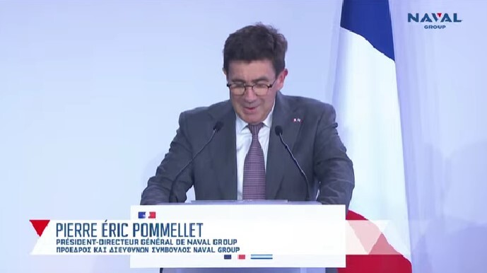 «Η Μεσόγειος γίνεται όλο και πιο στρατικοποιημένη. Είμαστε στο πλευρό της Ελλάδας καθώς κατανοούμε τον κίνδυνο. Έχουμε μία κοινή ασφάλεια ατζέντας. Τι μας χαρακτηρίζει εμάς ως Γάλλους; Καταδεικνύει την ικανότητά μας να παράγουμε ταχύτατα σε περιβάλλοντα επικίνδυνα. Ωστόσο αυτή η βιομηχανία παραμένει αξιόπιστη. Δίνουμε 2 δις ευρώ για τις φρεγάτες. Έχουμε τα υποβρύχια. Δεν μπορεί κανείς να ισχυριστεί ότι η γαλλική δημοκρατία δεν είναι σε θέση να αναβαθμίσει τις δυνάμεις της. Η Ελλάδα μας εμπιστεύεται και εμείς το χαιρετίζουμε. Θα ήθελα να πω λίγα λόγια για το Naval Group. Είναι πολύ συγκινητικό να βλέπει εδώ κανείς εργάτες από την Ελλάδα. Είναι ο σεβασμός που έχει κερδηθεί ανάμεσα στις δύο χώρες.».