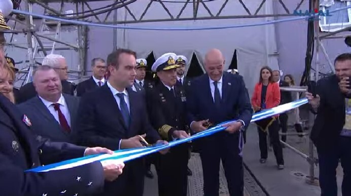 Κίμων: Η στιγμή που ο Νίκος Δένδιας κόβει την κορδέλα της φρεγάτας