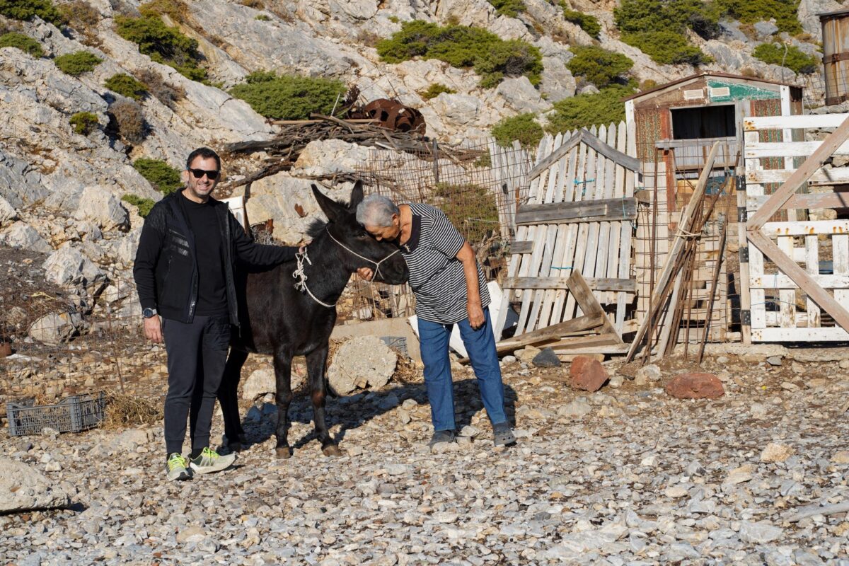 Και συνέχισε: «Εμείς ταξιδεύουμε στο Αιγαίο και κάθε φορά που περνάμε από εκεί, κάνουμε μία στάση, να πιούμε έναν καφέ, να ανταλλάξουμε απόψεις, και να πούμε την καλημέρα μας. το καλοκαίρι που κάναμε ένα πέρασμα – και το σπίτι της μεταμορφώθηκε λίγο – μου εξέφρασε μία επιθυμία: της λέω ‘τι σου λείπει’ και μου είπε ότι της λείπει ένα γαϊδουράκι. Και από εκεί και πέρα ξεκίνησε η επιχείρηση ‘γάιδαρος’ στην νήσο Κίναρο».