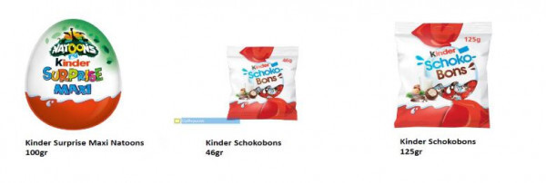 Ο ΕΦΕΤ ενημερώθηκε από το Σύστημα Έγκαιρης Προειδοποίησης για τα Τρόφιμα και τις Ζωοτροφές (RASFF), σχετικά με την προληπτική ανάκληση συγκεκριμένων παρτίδων των προϊόντων Kinder Schokobons των 46 gr & 125 gr και Kinder Surprise maxi των 100 gr, λόγω πιθανής παρουσίας σαλμονέλας.