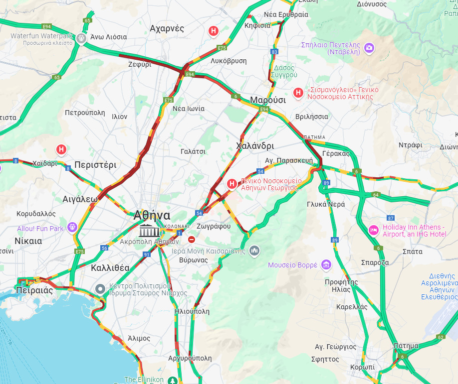 Παράλληλα, μεγάλα μποτιλιαρίσματα παρατηρούνται σε Κηφισό και Κηφισίας, δυσχεραίνοντας την κυκλοφορία προς και από το κέντρο της Αθήνας. Επίσης, σημαντικές καθυστερήσεις εντοπίζονται στην Αττική Οδό, τόσο στο ρεύμα προς Ελευσίνα όσο και προς Αεροδρόμιο.