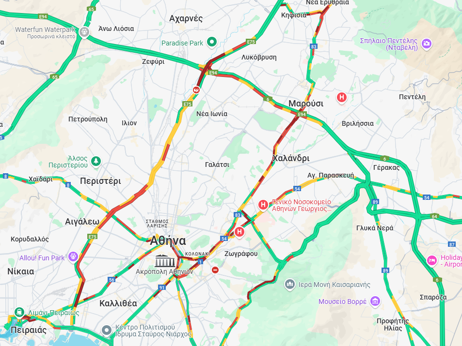 Την ίδια ώρα πρόβλημα στην κυκλοφορία των οχημάτων υπάρχει και στους δρόμους του Πειραιά, ιδιαίτερα κοντά στο λιμάνι. Η ίδια εικόνα επικρατεί και στο κέντρο της Αθήνας, με την κυκλοφορία να μην «κυλάει ομαλά», κυρίως στις λεωφόρους Βασιλέως Κωνσταντίνου, Αμαλίας, Βασιλίσσης Σοφίας, Σταδίου, Πανεπιστημίου και Συγγρού.