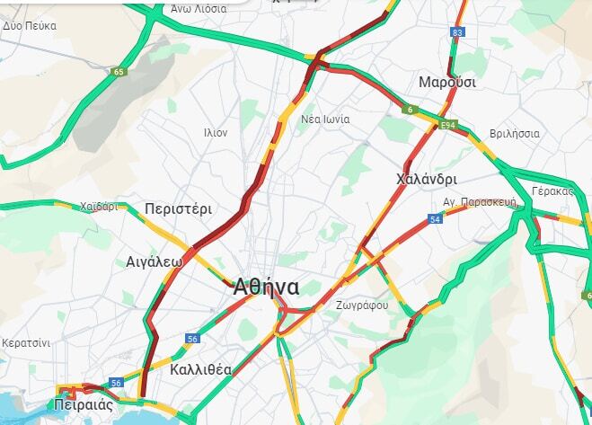 Ειδικότερα κατά μήκος του Κηφισού και ιδιαίτερα στην άνοδο όπου υπάρχει μποτιλιάρισμα από το Μοσχάτο έως και τη Νέα Φιλαδέλφεια. Την ίδια στιγμή στην κάθοδο στο «κόκκινο» βρίσκεται το τμήμα από τη Μεταμόρφωση έως και τη Νέα Φιλαδέλφεια ενώ με χαμηλές ταχύτητες διεξάγεται η κίνηση από το ύψος της Λιοσίων μέχρι και το Αιγάλεω.