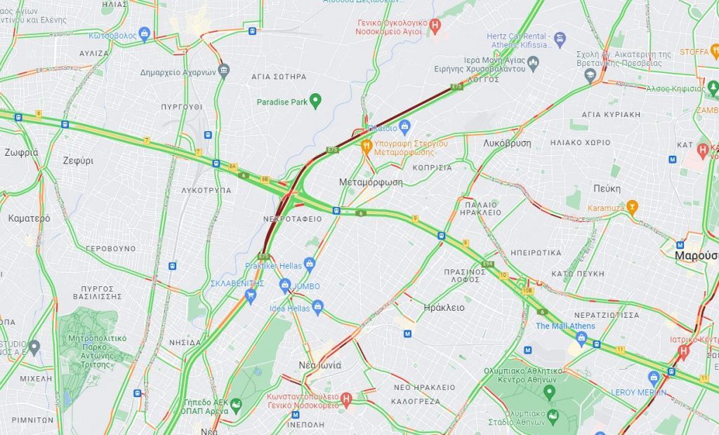 Το τροχαίο σημειώθηκε λίγο μετά την Αττική Οδό και οι ουρές των οχημάτων που σχηματίζονται φτάνουν μέχρι τη Λυκόβρυση.
