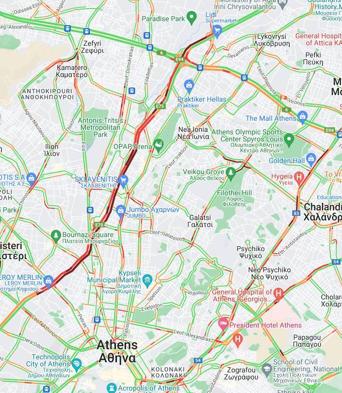 Το μεγαλύτερο πρόβλημα καταγράφεται στην κάθοδο του Κηφισού λόγω δύο τροχαίων που σημειώθηκαν νωρίτερα με αποτέλεσμα τα οχήματα να κινούνται με χαμηλές ταχύτητες από τη Λυκόβρυση μέχρι τη λεωφόρο Αθηνών.