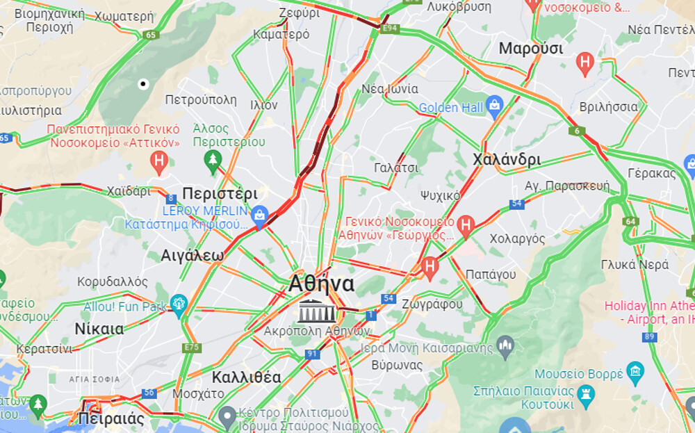 Στο “κόκκινο” είναι για μια ακόμη φορά ο Κηφισός και στα δύο ρεύματα, ενώ προβλήματα εντοπίζονται και στον Πειραιά, στη Μικράς Ασίας καθώς και στους δρόμους γύρω από το λιμάνι.