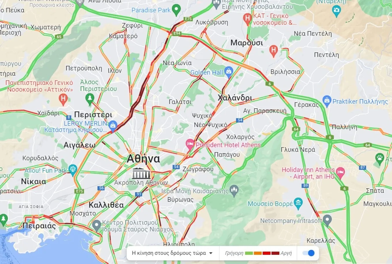Επί της λεωφόρου Κηφισίας τα οχήματα κινούνται με χαμηλές ταχύτητες στο ρεύμα ανόδου στο ύψος του Ψυχικού και στο ρεύμα προς Αθήνα στο ύψος Αμαρουσίου.