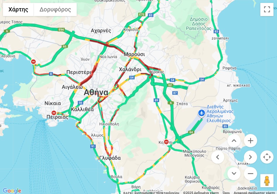 - Στο ρεύμα προς Αεροδρόμιο, οι καθυστερήσεις ξεπερνούν τα 30 λεπτά, από τον κόμβο Φυλής έως τον κόμβο Κηφισίας.