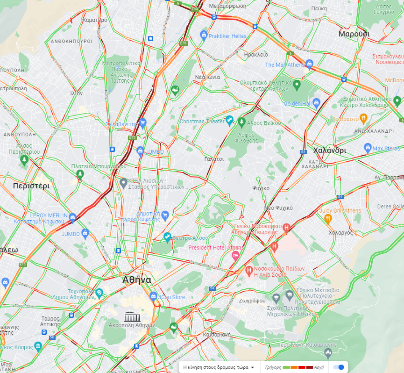 Χαμηλές ταχύτητες σημειώνονται και στο ανοδικό ρεύμα της Συγγρού και επί της Βασιλέως Κωνσταντίνου.