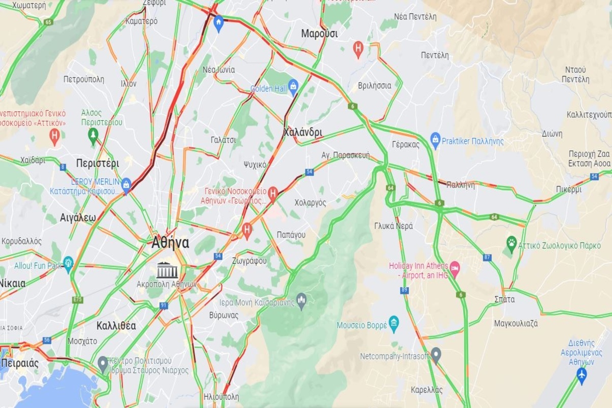 Παρόμοια κατάσταση και στα δύο ρεύματα της Κηφισίας ενώ τόσο η λεωφόρος Βεϊκού όσο και αυτής της Γαλατσίου κυριολεκτικά φαντάζουν απροσπέλαστες.
