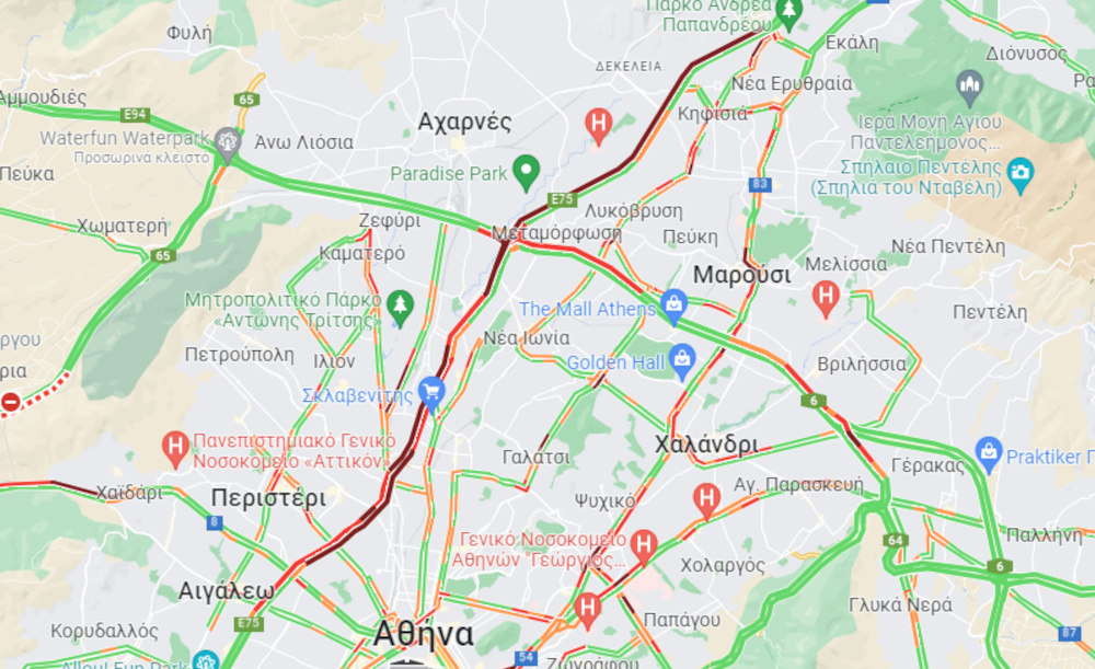 5΄-10΄ από κόμβο Πλακεντίας έως κόμβο Κηφισίας.