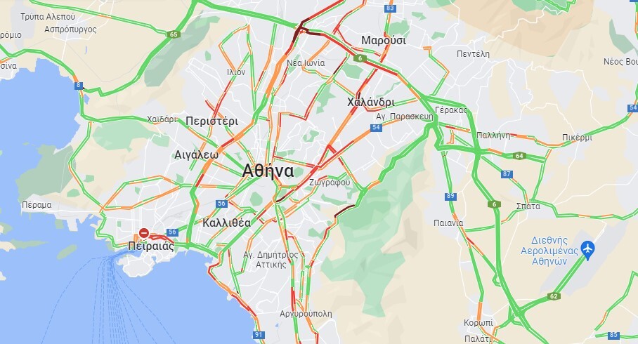 Το αδιαχώρητο επικρατεί στο ρεύμα της Εθνικής Οδού προς Πειραιά από τον Λόγγο μέχρι και τον Κόκκινο Μύλο. Δύσκολα είναι τα πράγματα και στην Αττική Οδό στο ρεύμα προς Μαρκόπουλο από τη Μεταμόρφωση μέχρι και την Κων/ νου Καραμνλή.
