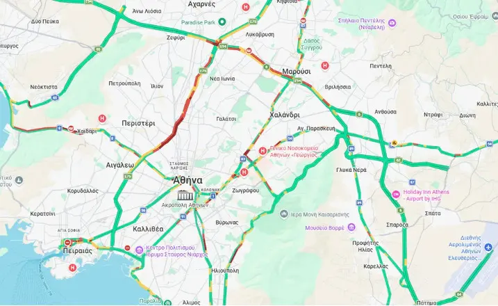 Ο Κηφισός είναι στα κόκκινα τόσο στο ρεύμα ανόδου όσο και καθόδου ενώ κίνηση υπάρχει στην Αθηνών-Κορίνθου/Λ. Αθηνών (έξοδος), Αθηνών-Κορίνθου/Λ. Αθηνών (είσοδος), στην Αθηνών-Λαμίας(Αθηνών έως κόμβος Καλυφτάκη -έξοδος) από Αχαρνές έως Φιλαδέλφεια και στην Αθηνών-Λαμίας(κόμβος Καλυφτάκη έως Αθηνών-είσοδος).