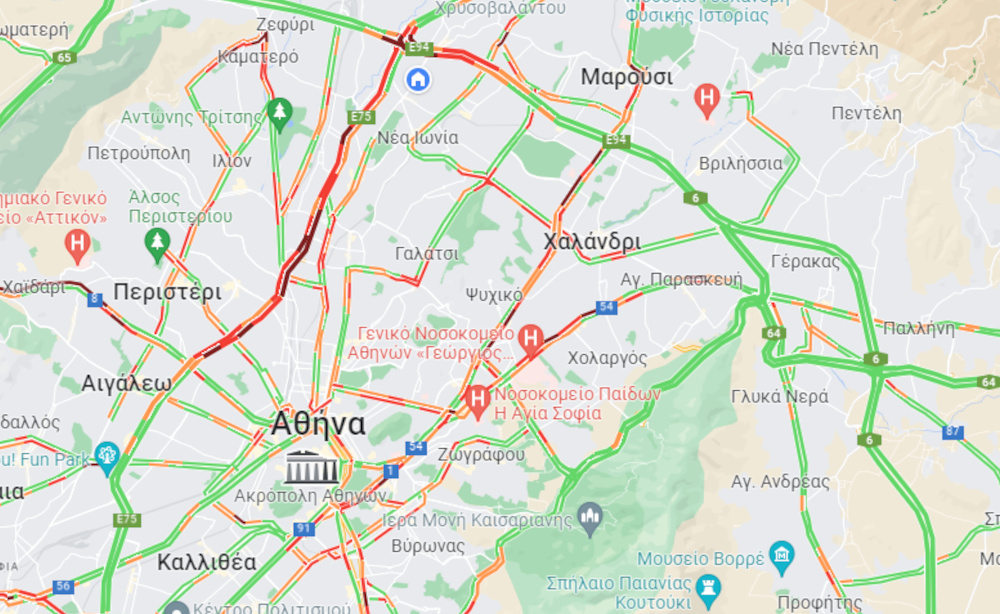 Κίνηση υπάρχει στην άνοδο της Λεωφόρου Κηφισού από τα ΚΤΕΛ προς Αχαρνών, όπως και στα δύο ρεύματα της Λεωφόρου Κηφισίας από τους Αμπελόκηπους προς Μαρούσι. Καθυστερήσεις υπάρχουν στην Κατεχάκη στο ρεύμα από Ηλιούπολη, ανά τμήματα στην Περιφερειακή Αιγάλεω, στο ρεύμα προς Πειραιά στη Λ. Ποσειδώνος από το Ελληνικό προς Μαρίνα Φλοίσβου, στην Βασιλέως Κωνσταντίνου, ανά τμήματα στα δύο ρεύματα της Αλεξάνδρας και τέλος στους δρόμους που οδηγούν στο Λιμάνι του Πειραιά