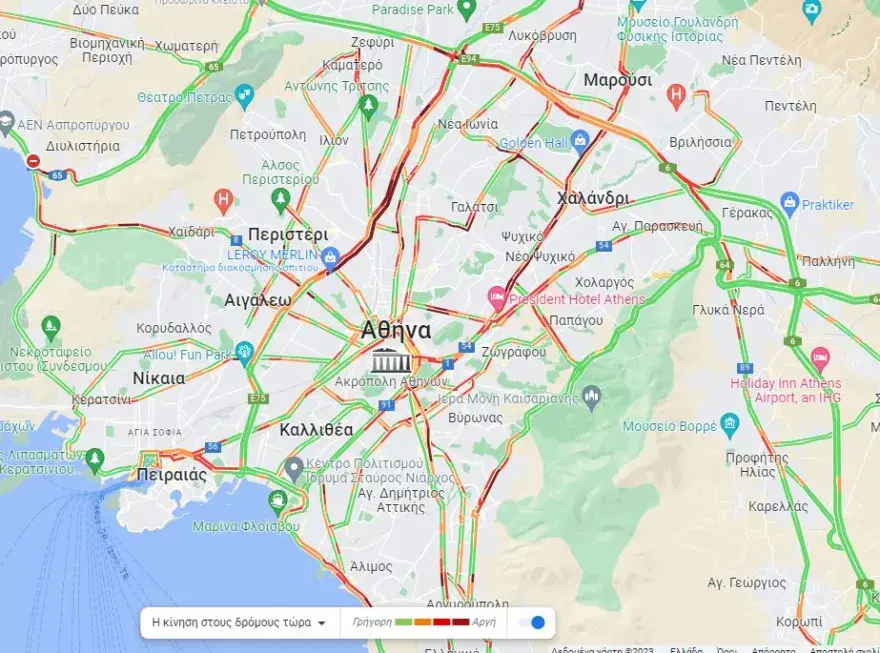 Όπως φαίνεται στον χάρτη με την κίνηση στους δρόμους από την Google οι περισσότεροι κεντρικοί δρόμοι στο λεκανοπέδιο είναι στο «κόκκινο» λίγο μετά τις 8:30 το πρωί της Τετάρτης.