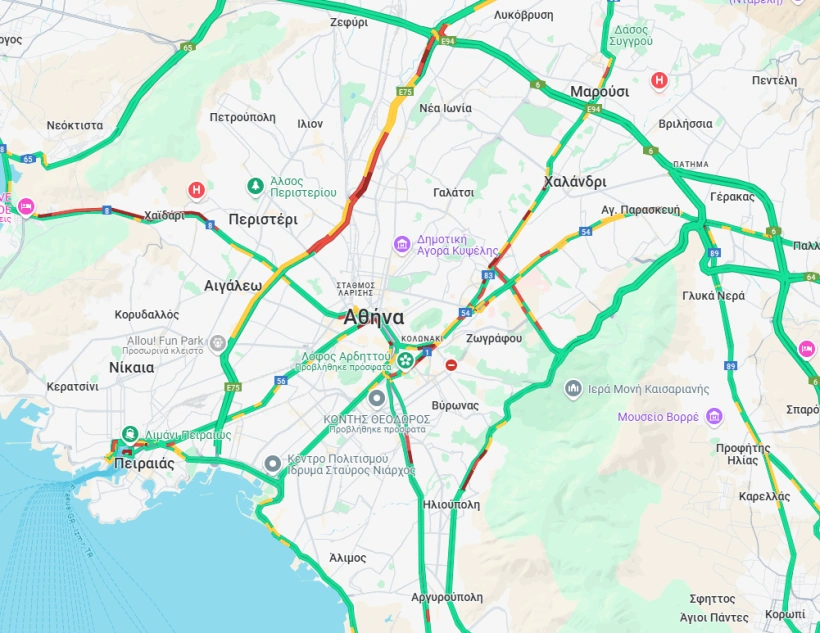 Έντονο μποτιλιάρισμα καταγράφεται και στη Λεωφόρο Αθηνών, από το ύψος του Χαϊδαρίου μέχρι τον Σκαραμαγκά.