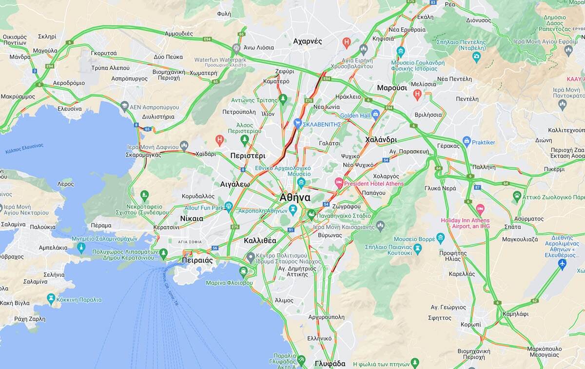 Στο «κόκκινο» είναι η κίνηση στη Λ.Κηφισού και στα δύο ρεύματα, η Λ.Κηφισίας τμηματικά και στα δύο ρεύματα και η Λ.Μεσογείων στην κάθοδο.