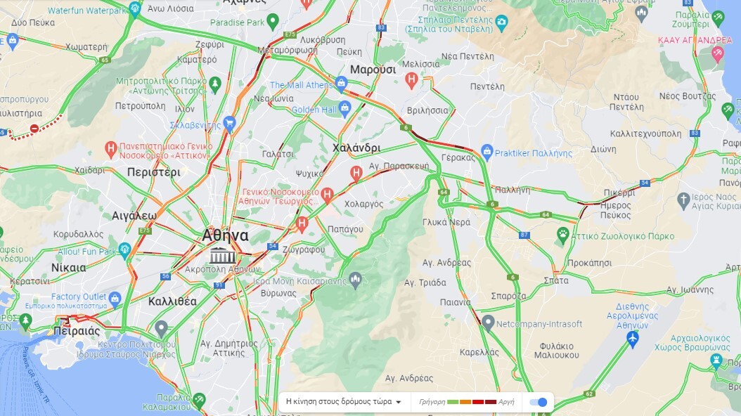 Αττική Οδός στην ίδια κατάσταση… Στο κόκκινο είναι η Αττική Οδός από το ύψος του Γέρακα μέχρι και τον προαστιακό της Κηφισίας.