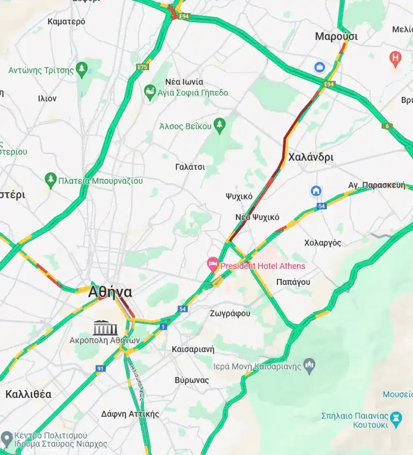 Η κίνηση είναι έντονη και στα δύο ρεύματα λόγω του τροχαίου ατυχήματος. Ειδικότερα, στο ανοδικό ρεύμα από την Κατεχάκη προς τη Φιλοθέη και στο καθοδικό από την Αττική Οδό προς τη Φιλοθέη.