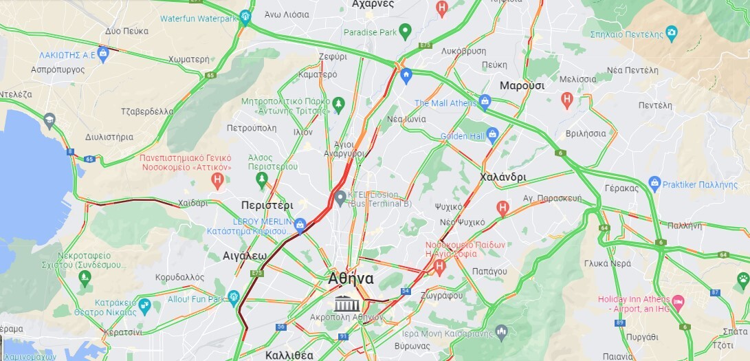 Η κυκλοφορία βρίσκεται στο «κόκκινο» όπως θα δείτε και στον live χάρτη της Google, με τα μεγαλύτερα προβλήματα να υπάρχουν από το ύψος του Ρουφ έως τη Νέα Φιλαδέλφεια.