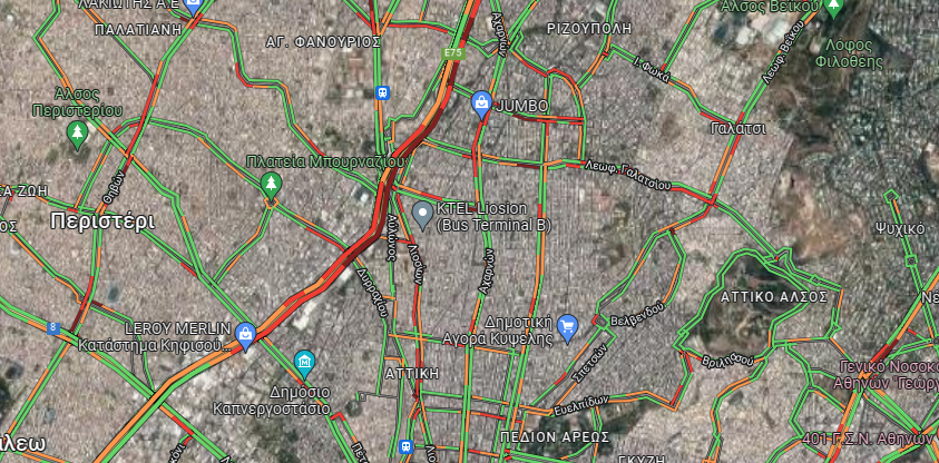 Συγκεκριμένα, αυξημένη είναι η κίνηση και στα δύο ρεύματα στον Κηφισό. Ειδικότερα, στην άνοδο του Κηφισού, η κίνηση ξεκινά από το ύψος του Περιστερίου, έως και τη Μεταμόρφωση, ενώ στην κάθοδο η κίνηση ξεκινά από τον Κόκκινο Μύλο έως το Αιγάλεω.