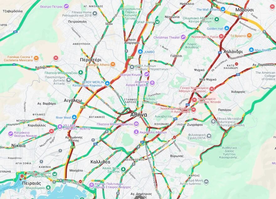 Η Λεωφόρος Κηφισίας έχει μετατραπεί σε «ακινητοποιημένη ζώνη», με τα οχήματα να κινούνται αργά από τη Λεωφόρο Αλεξάνδρας μέχρι το Ψυχικό. Αντίστοιχα, η Μεσογείων παρουσιάζει σοβαρά προβλήματα από την Κατεχάκη μέχρι τον κόμβο του Γέρακα.