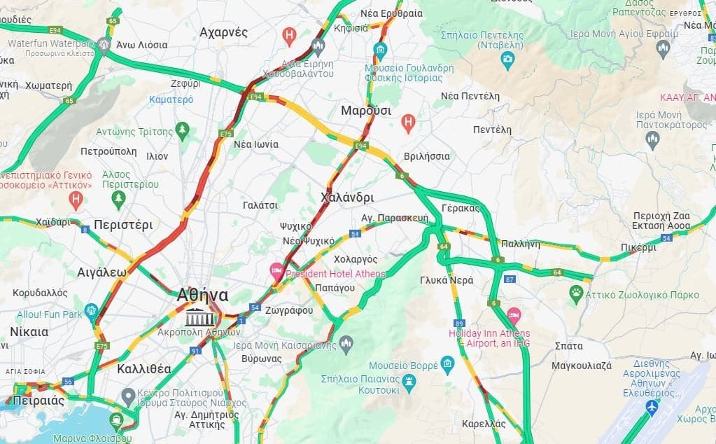 Ακινητοποιημένα τα οχήματα από το ύψος της Κηφισιάς μέχρι τον Ρέντη. Κίνηση και στην άνοδο του Κηφισού από το ύψος του Ρέντη μέχρι τη Νέα Ιωνία.