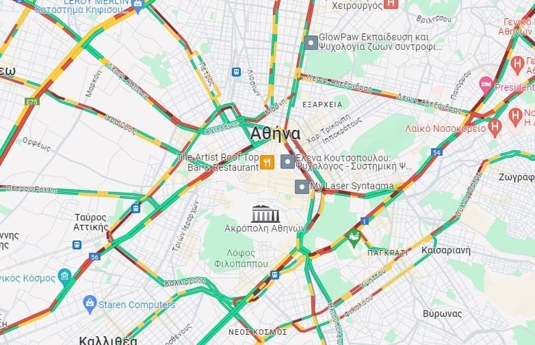 Επίσης προβλήματα υπάρχουν στην άνοδο της Κηφισίας από την Κατεχάκη έως την Εθνικής Αντιστάσεως και από την Καποδιστρίου έως και το Δαχτυλίδι. Στην κάθοδο υπάρχει κίνηση από την Φιλοθέη έως και το Κολλέγιο Αθηνών. Επιπλέον με χαμηλές ταχύτητες κινούνται τα ΙΧ ανά τμήματα στην λεωφόρο Αλεξάνδρας και στα δύο ρεύματα ενώ στο «κόκκινο» είναι το κομμάτι της λεωφόρου Αλίμου – Κατεχάκη από του Ζωγράφου έως τον Βύρωνα.