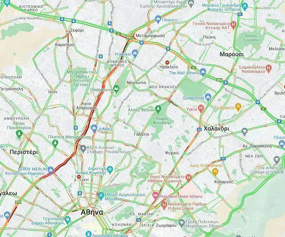 Με χαμηλές ταχύτητες κινούνται τα οχήματα και στην λεωφόρο Κηφισίας όπου από το ύψος του Αμαρουσίου αλλά και του Ψυχικού, υπάρχει αυξημένη κίνηση τόσο στο ρεύμα ανόδου όσο και καθόδου, ενώ καθυστερήσεις τουλάχιστον δέκα λεπτών, διαπιστώνονται και στην Αττική Οδό κυρίως στο ρεύμα προς αεροδρόμιο.