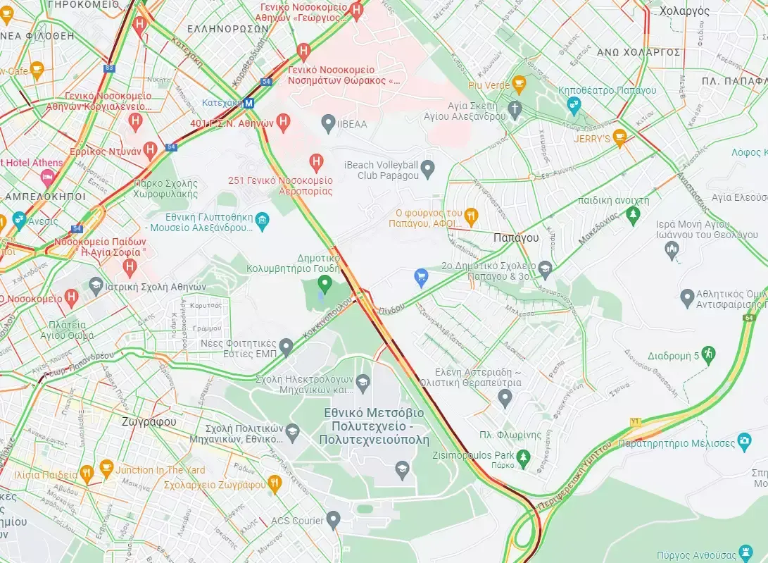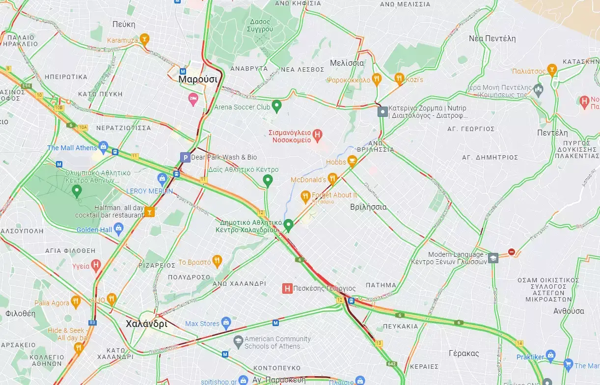10΄-15΄από κόμβο Μεταμόρφωσης έως κόμβο Κηφισίας, 10΄-15΄στην έξοδο για Λαμία.