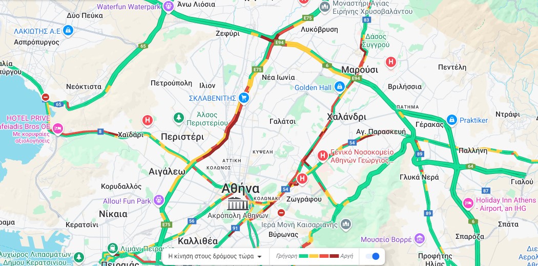 Όπως μπορείτε να δείτε και στον παραπάνω χάρτης της google, η κίνηση είναι στο κόκκινο στην Εθνική Οδό κυρίως στο ρεύμα προς Λαμία, τόσο στο ύψος του Περιστερίου αλλά και σε αυτό της Μεταμόρφωσης.