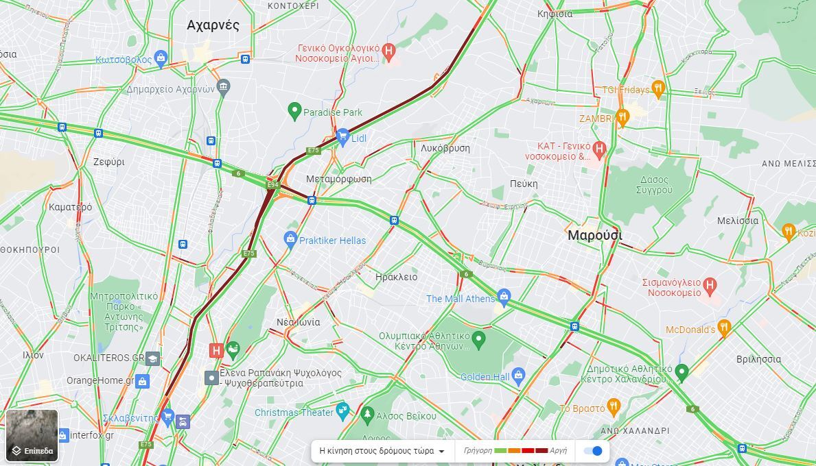 Η Λεωφόρος Κηφισίας, τόσο στην άνοδο όσο και στην κάθοδο, δεν αντιμετωπίζει ιδιαίτερα προβλήματα. Το κέντρο ωστόσο είναι στο κόκκινο. Δυσκολίες θα αντιμετωπίσουν οι οδηγοί που κινούνται στις οδούς Φορμίωνος, Υμηττού, Λεωφόρο Εθνικής Αντιστάσεως και πολλές άλλες που βρίσκονται περιμετρικά της Πλατείας Συντάγματος.