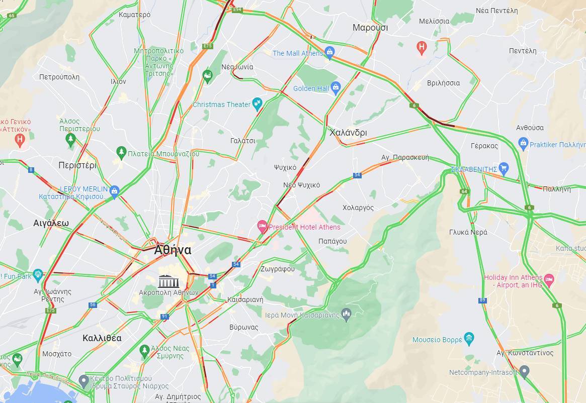 Με αργές ταχύτητες κινούνται επίσης τα οχήματα επί της Λ. Κηφισίας και στα δύο ρεύματα, όπως επίσης και στους δρόμους γύρω από το κέντρο της Αθήνας.