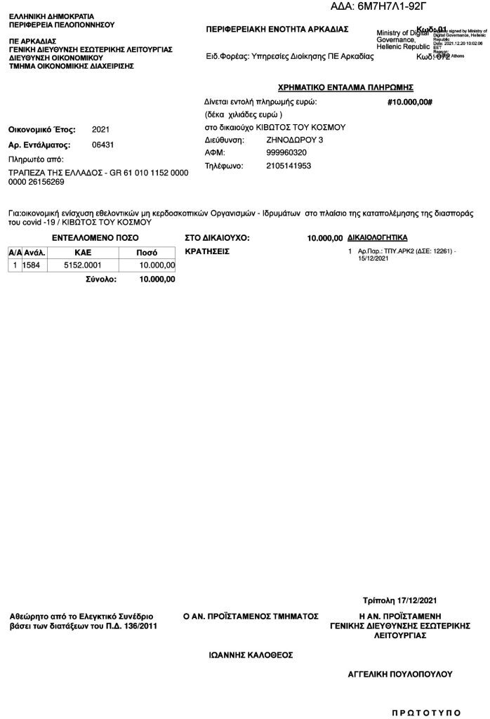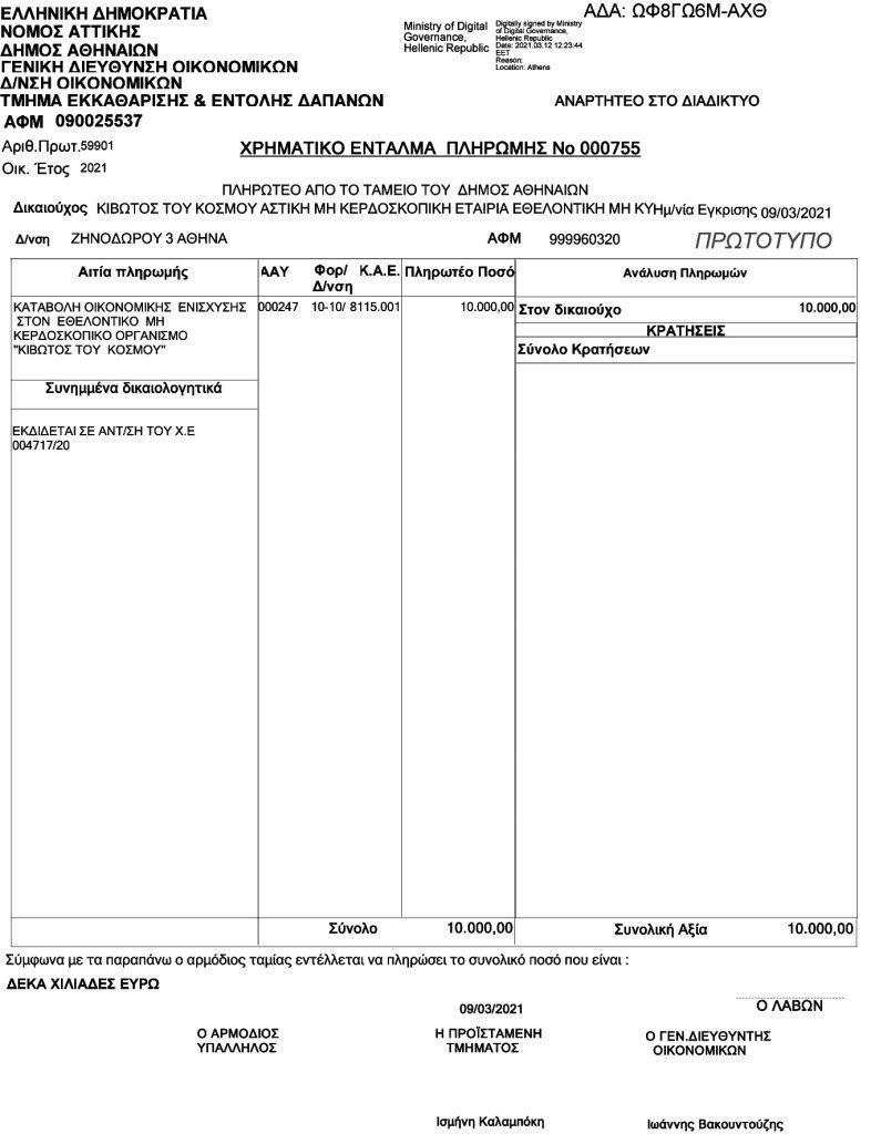 Από τη Διαύγεια πληροφορούμαστε ότι δωρεές υπέρ της Κιβωτού προσέφεραν επιμελητήρια, ο ΕΟΦ, τα ΕΛΤΑ, η ΕΡΤ, πανεπιστήμια κ.ά.