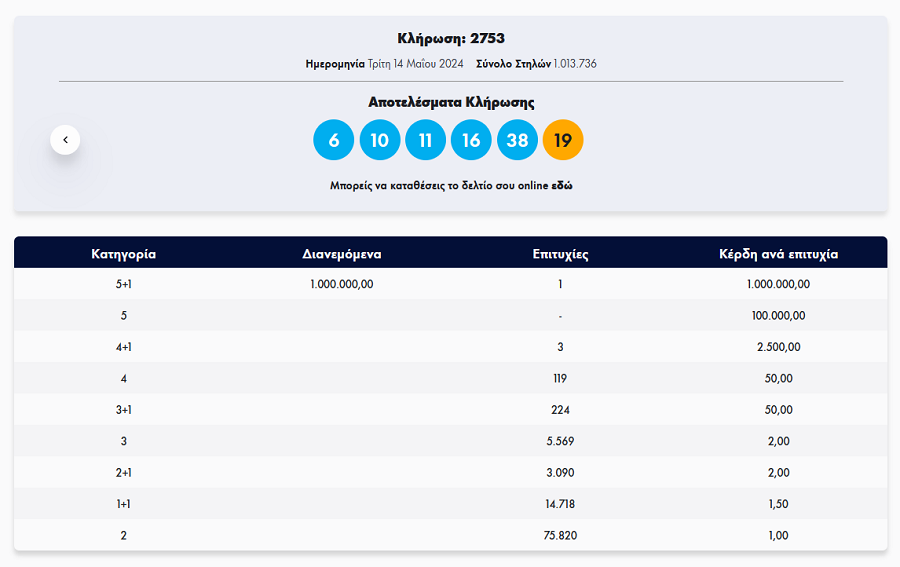 Στην κλήρωση Τζόκερ ΟΠΑΠ, σήμερα Τρίτη 14 -05-2024 (αριθμός κλήρωσης 2753), οι τυχεροί αριθμοί ήταν οι:6, 10, 11, 16, 38 και Τζόκερ ο αριθμός: 19.