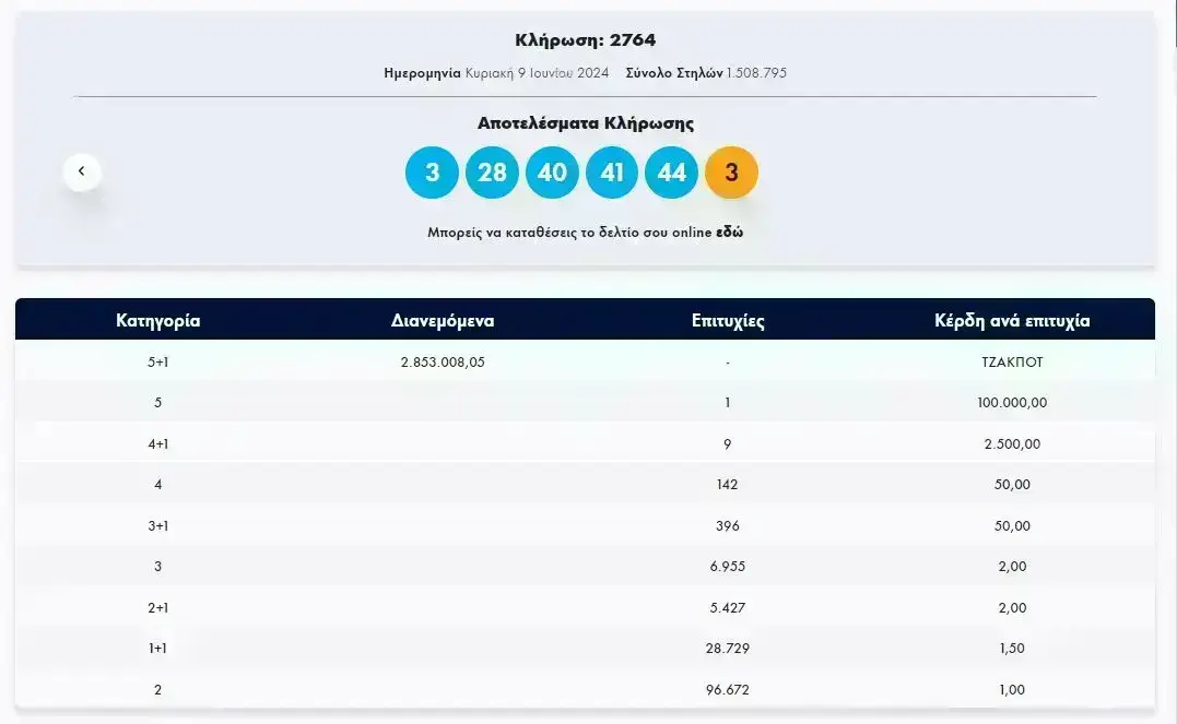 Στην κλήρωση Τζόκερ ΟΠΑΠ, σήμερα Κυριακή 09/06/2024, οι τυχεροί αριθμοί ήταν οι:3, 28, 40, 41, 44 και Τζόκερ ο αριθμός 3.