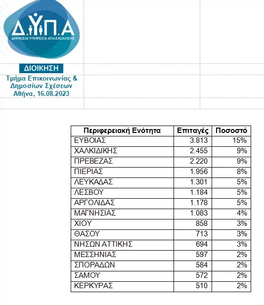 Επισυνάπτονται οι 15 περιφερειακές ενότητες με τον μεγαλύτερο αριθμό ενεργοποιημένων επιταγών σε τουριστικά καταλύματα κατά το πρώτο δεκαπενθήμερο του Αυγούστου 2023.