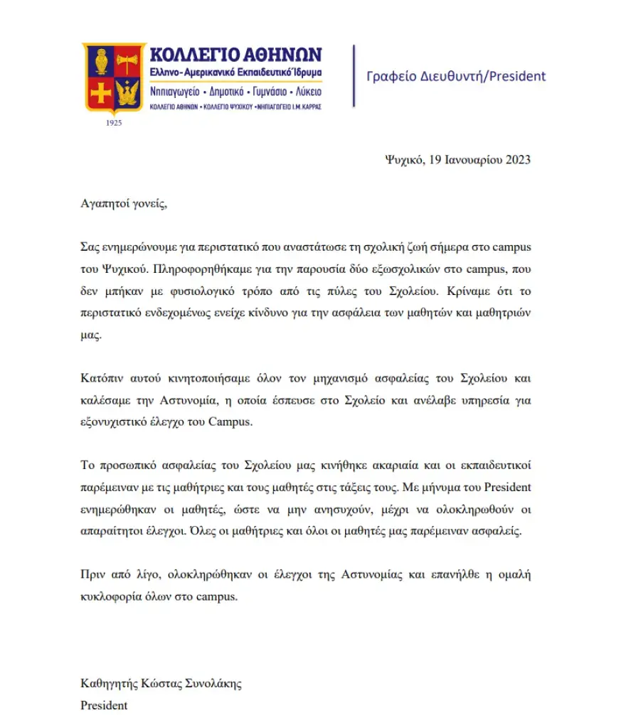 Σας ενημερώνουμε για περιστατικό που αναστάτωσε τη σχολική ζωή σήμερα στο campus του Ψυχικού. Πληροφορηθήκαμε για την παρουσία δύο εξωσχολικών στο campus, που δεν μπήκαν με φυσιολογικό τρόπο από τις πύλες του Σχολείου. Κρίναμε ότι το περιστατικό ενδεχομένως ενείχε κίνδυνο για την ασφάλεια των μαθητών και μαθητριών μας.