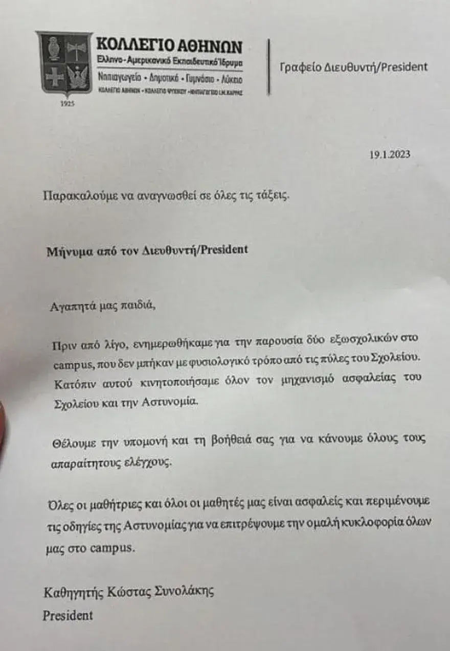 Με δύο ανακοινώσεις η διεύθυνση του Κολλεγίου Αθηνών ενημέρωσε για την αναστάτωση που προκλήθηκε στο Κολλέγιο μετά την πληροφορία για εισβολή αγνώστων στο campus. Όπως αναφέρεται στην πρώτη ανακοίνωση όλοι οι μαθητές είναι ασφαλείς «και αναμένονται οι οδηγίες της αστυνομίας για επιστροφή στην ομαλή κυκλοφορία στο campus».