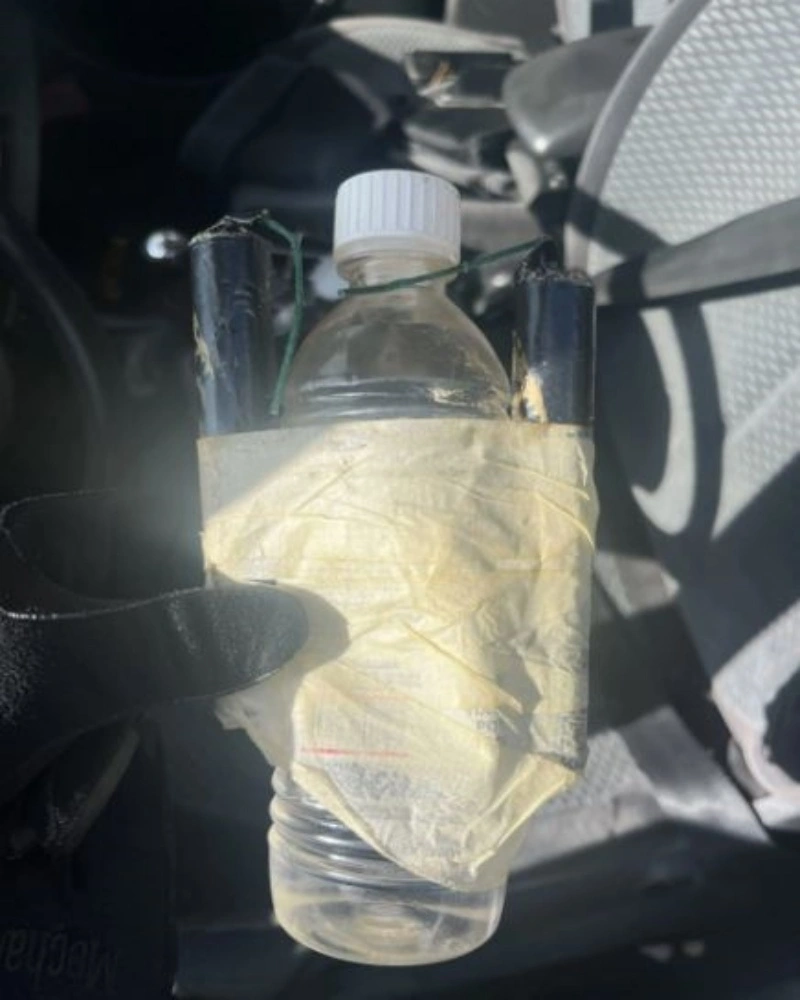 - αυτοσχέδιος εμπρηστικός μηχανισμός, αποτελούμενος από πλαστικό μπουκάλι με υγρό άγνωστης χημικής σύστασης και δύο κροτίδες τοποθετημένες γύρω από αυτό,