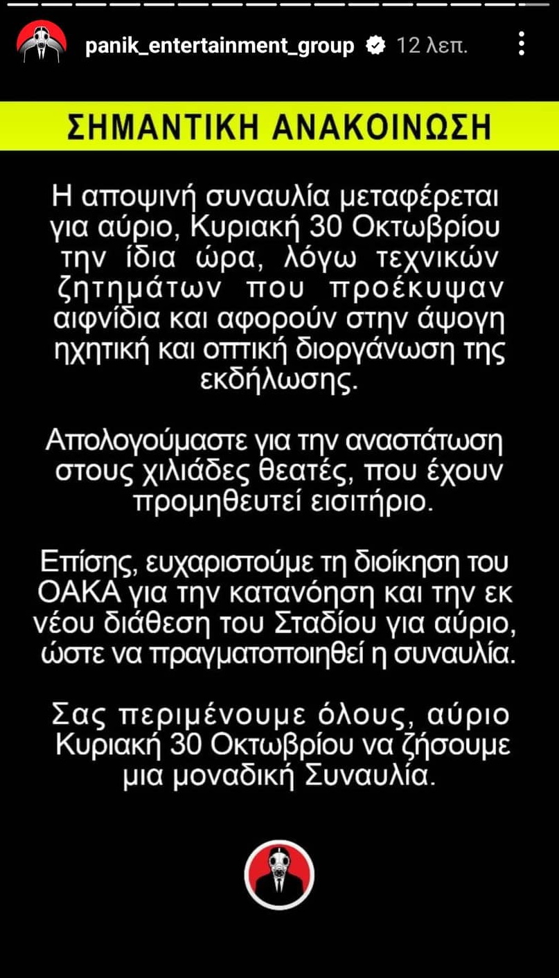 Επίσης, ευχαριστούμε τη διοίκηση του ΟΑΚΑ για την κατανόηση και τη εκ νέου διάθεση του σταδίου για αύριο, ώστε να πραγματοποιηθεί η συναυλία.