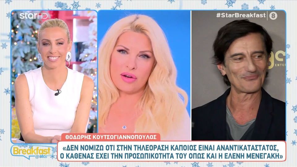 Στη συζήτηση που ακολούθησε, ο Κουτσογιαννόπουλος επέμεινε στην ιδέα της μοναδικότητας κάθε ανθρώπου και εξήγησε ότι η έννοια της αντικατάστασης είναι πιο πολύπλοκη από ό,τι συχνά παρουσιάζεται σε δημοσιογραφικά σχόλια και τηλεοπτικές αναλύσεις. Υπενθύμισε ότι οι θεατές συνηθίζουν σε συγκεκριμένα πρόσωπα, αλλά τόνισε ότι αυτό δεν συνεπάγεται αναγκαστικά αδυναμία του μέσου να λειτουργήσει χωρίς αυτά. Σημείωσε ότι η αλλαγή προσώπου σε μια εκπομπή εμπλέκει επιλογές παραγωγής, προσαρμογές μορφής και επιχειρησιακά κριτήρια που δεν επιλύονται με μονολεκτικές κρίσεις. Όταν ρωτήθηκε αν γνωρίζει ή αν υπάρχει σχέδιο για την επιστροφή της Ελένης Μενεγάκη στην τηλεόραση, απάντησε με σύντομη και ξεκάθαρη φράση: «Δεν έχω ιδέα. Είναι μια χαρά, ευχαριστώ», αποφεύγοντας να παράσχει πληροφορίες ή χρονοδιαγράμματα και διαχωρίζοντας την προσωπική γνώμη από επιβεβαιωμένες ειδήσεις. Απέφυγε επίσης να συνδέσει την απουσία της παρουσιάστριας με συγκεκριμένα επαγγελματικά βήματα ή προτάσεις.