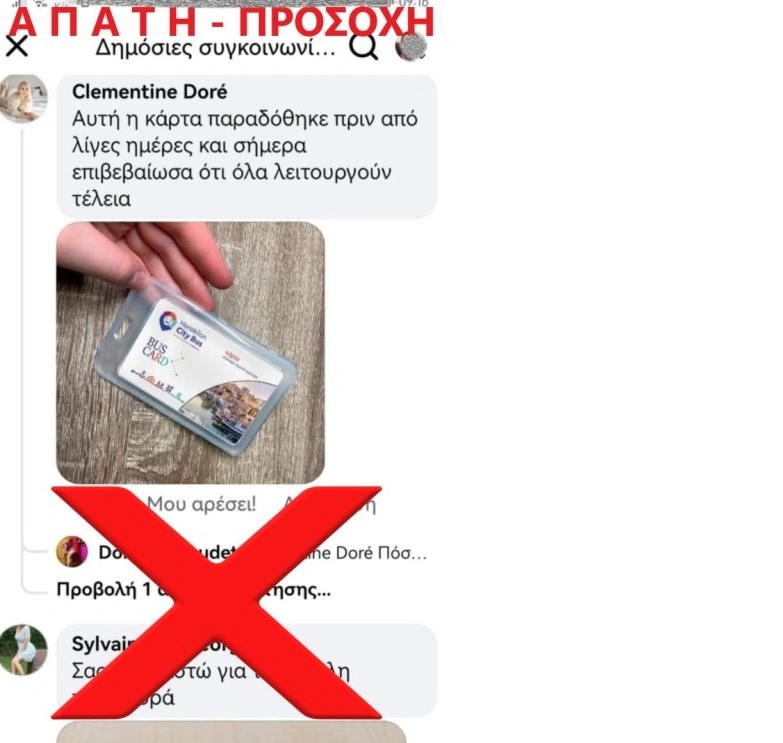 Σύμφωνα με το cretapost.gr, τις τελευταίες ημέρες στα social media κυκλοφορεί μία ανάρτηση με την οποία οι απατεώνες προσπαθούν να προσελκύσουν πολίτες τάζοντάς τους μία κάρτα η οποία θα δίνει δωρεάν μετακινήσεις για έξι μήνες με τα αστικά λεωφορεία στο Ηράκλειο με κόστος 2,35 ευρώ!